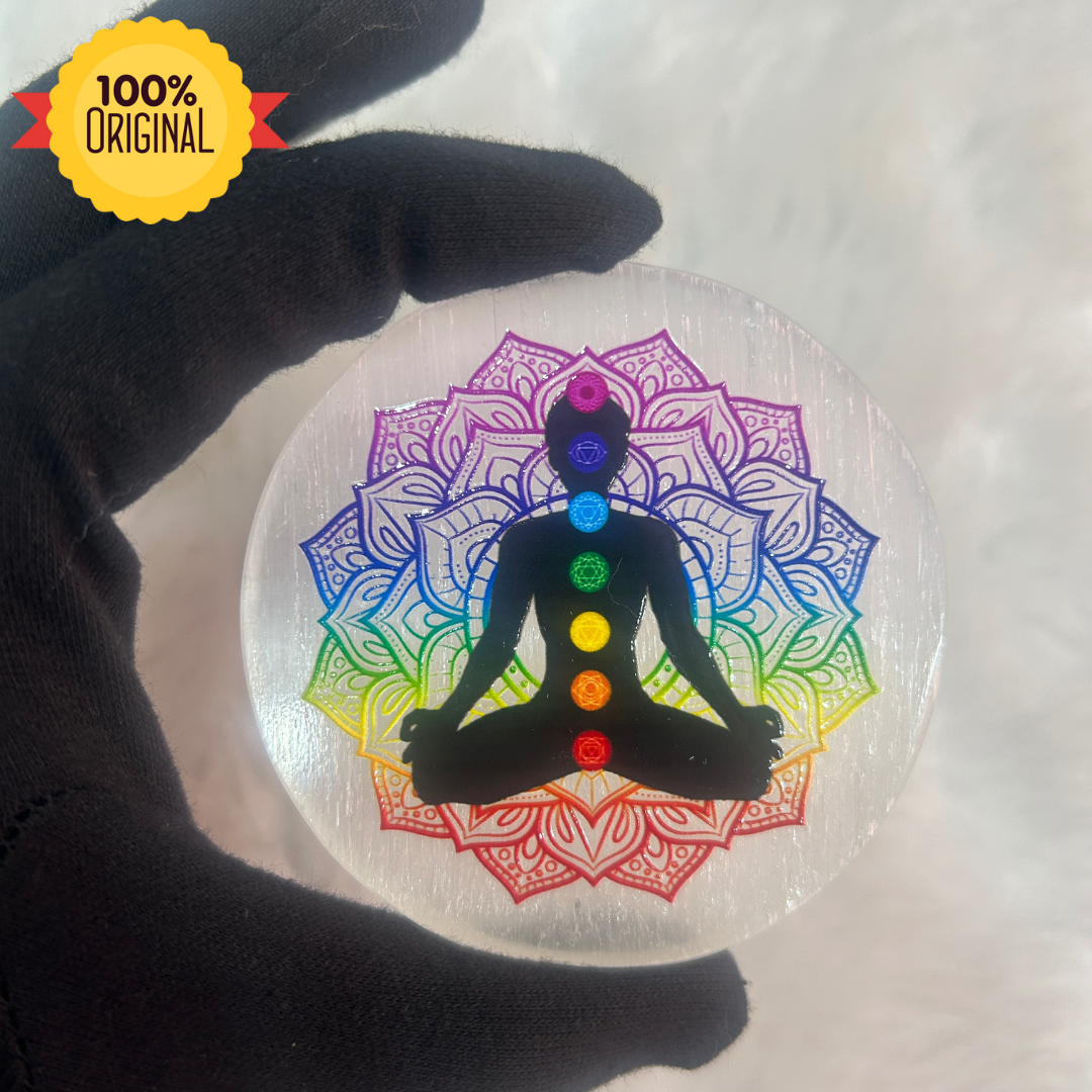 Selenite Charging Plate Coaster with 3D 7 Chakra Symbol
